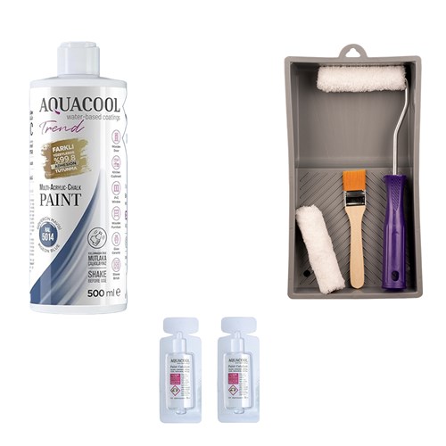 • Set İçeriği; 1 adet dönüşüm boyası 500 ml, 2 adet katalizör, 3 parça boyama seti(1 adet saplı ve 1 adet sapsız 10 cm parlak rulo, 15x27 boya tavası, zemin fırçası,)